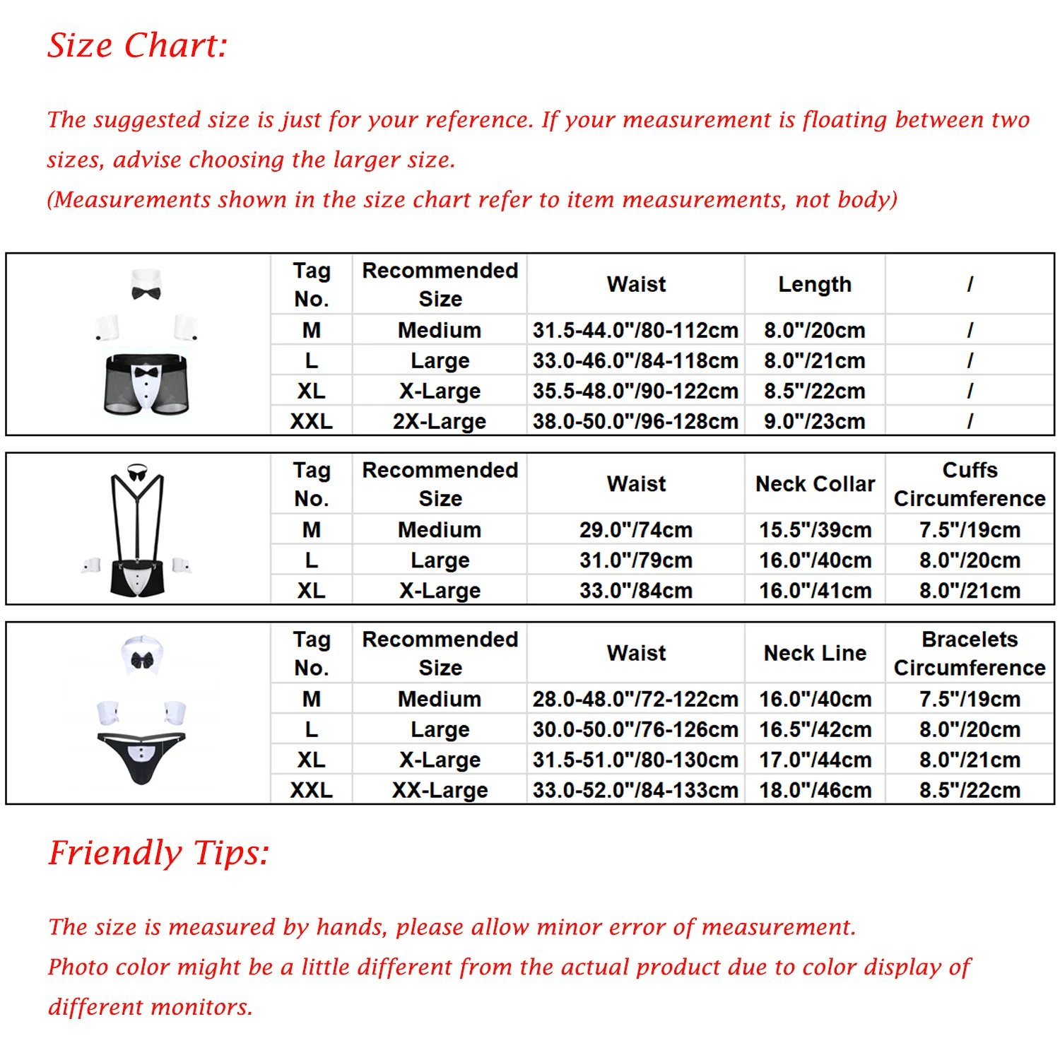 Comes with elastic bow tie & cuffs set and elasticized shoulder suspenders with silver clips on front and back.